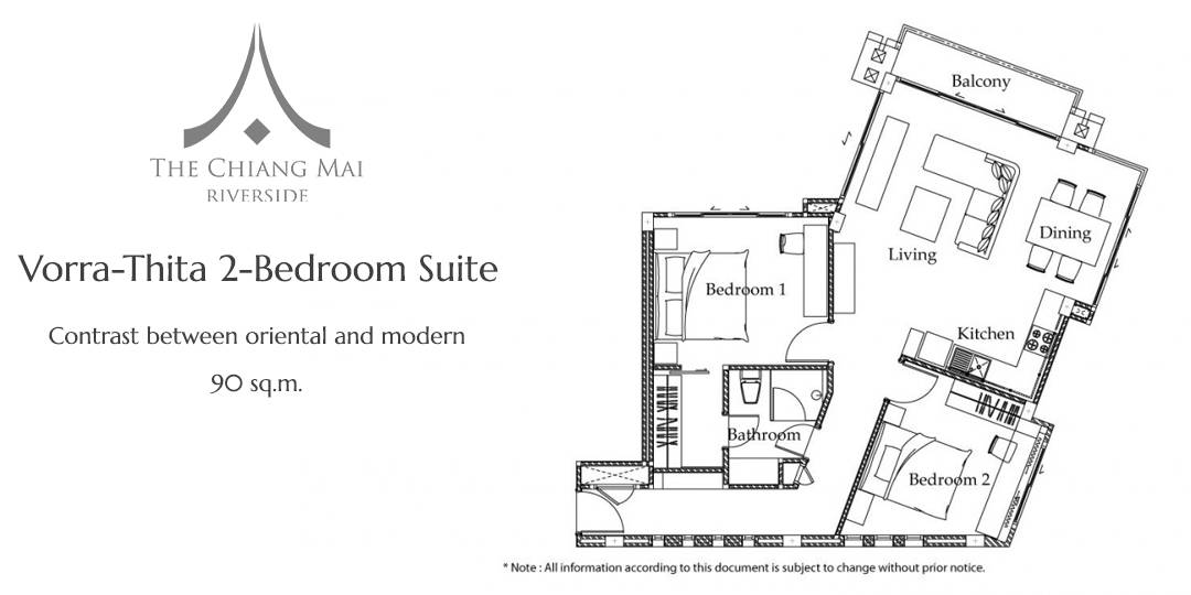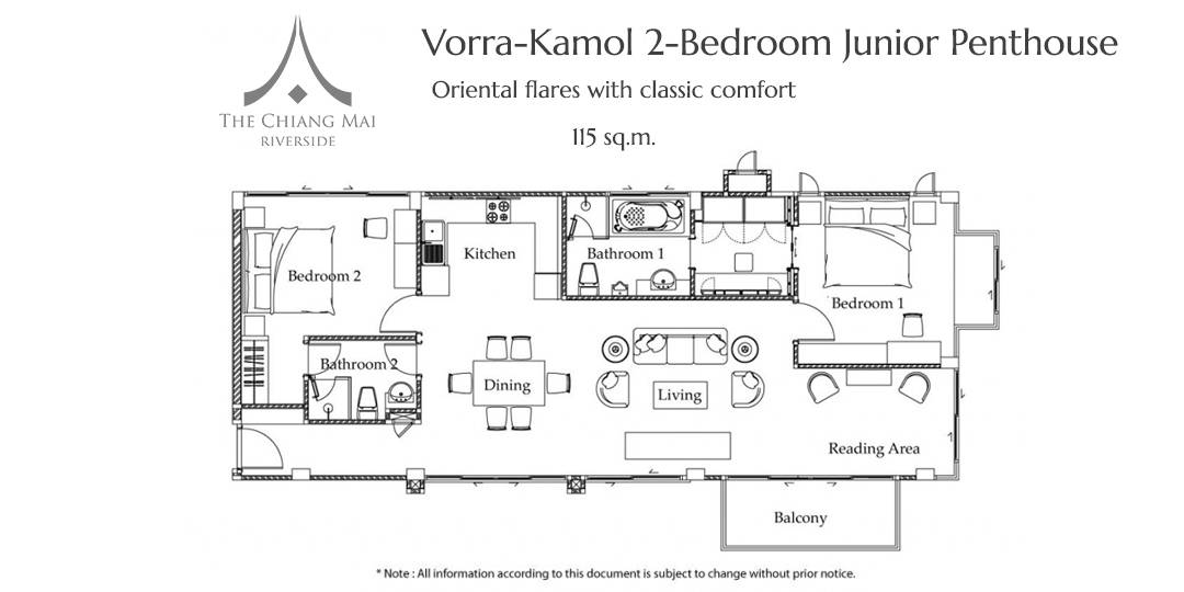 Located on the top floor, the 120 sq.m. Penthouse is a palatial statement in indulgence, refinement and embodies all the quality and values for which the hotel residence is renowned. Floor-to-ceiling windows let the natural light flood in or simply step outside onto the large balcony overlooking the Ping River and set up breakfast or dinner for your self, family or friends. Features also include a fully equipped modern-chic kitchen, two bedrooms and two bathrooms.